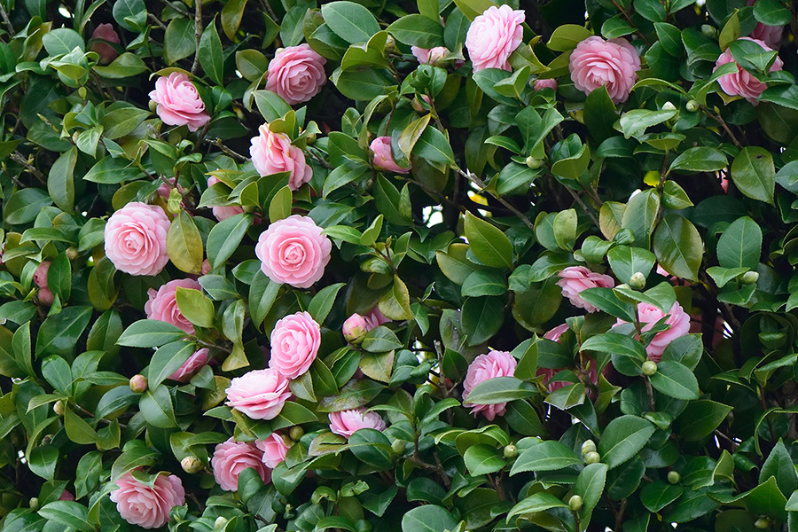八重咲き(千重咲き)の園芸品種で、花付きがとても良いようで、たくさんのピンクの花を咲かせます。花弁の先端は柔らかく凹み、八重にありがちな折り重なりの乱れをまったく感じさせません。ユキツバキ(雪椿:ヤブツバキが多雪地帯に適応したとか)から派生した品種だそうです。