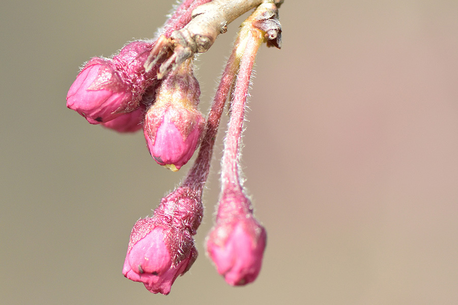 ヤエベニシダレの蕾です。色が濃いですが、開花時には、枝垂れた姿と相まって、美しい桜色になります。