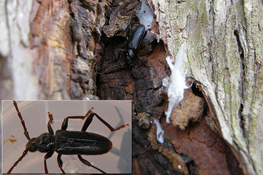 普通スギカミキリは黒いエリトラ(翅鞘)に4つの黄斑があり、独特の彫刻のある前胸背と共に、それが美しい魅力になっているのですが、ときおり見掛けるこの黒化型がまた何とも言えず魅力的です。