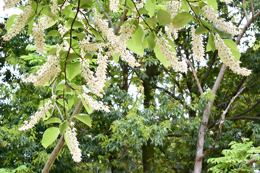 花はエゴノキに似ていますが、葉がとても大きく、花(エゴノキよりやや大きい)の並び方などで見分けられます。