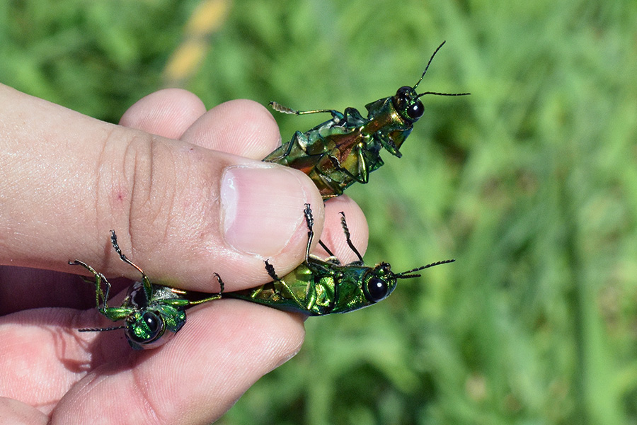 大型で美しい虫ですが、実は比較的身近なところにいて、棲息数もそれなりです。梅雨明けの榎の梢を見上げて、こんな特徴的なシルエットが見えたら、それがヤマトタマムシです。