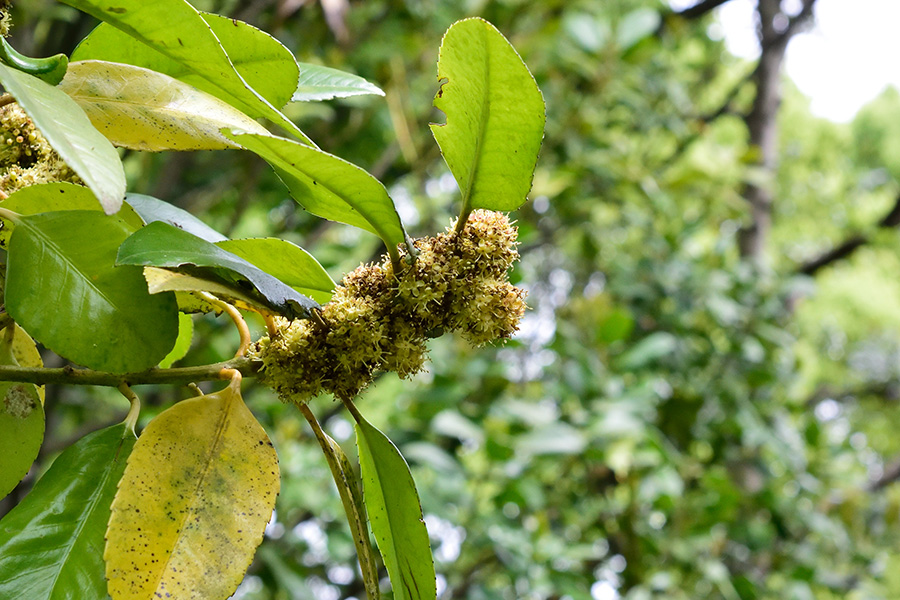常緑の雌雄異株で、葉の裏を尖ったものでなぞると、黒く文字が書けることで知られ、葉書の木などと呼ばれることもあるようです。