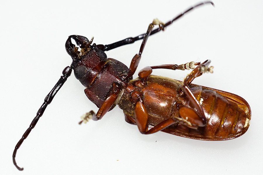 夜行性のカミキリムシで、昼間は、スダジイの巨木の虚などに潜んでいます。昼間狭い空間に潜んでいるのに、複眼は頭部の下側にまで及んでいて、むしろこちら側の方が大きく感じるほどです。