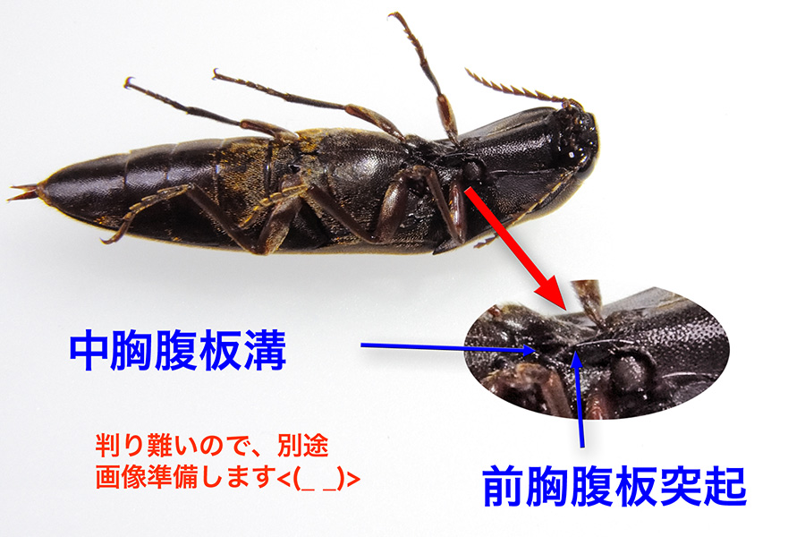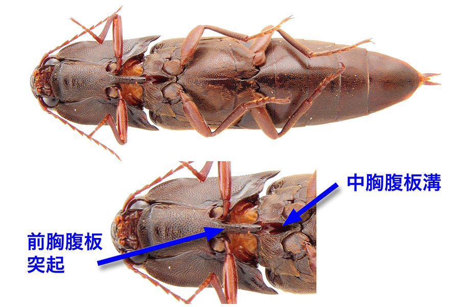 ※多くのコメツキムシは、前胸腹板突起と中胸腹板にある溝(中胸腹板溝)を利用して、弾けるように跳びます(この写真では突起が溝に差し込まれています)。