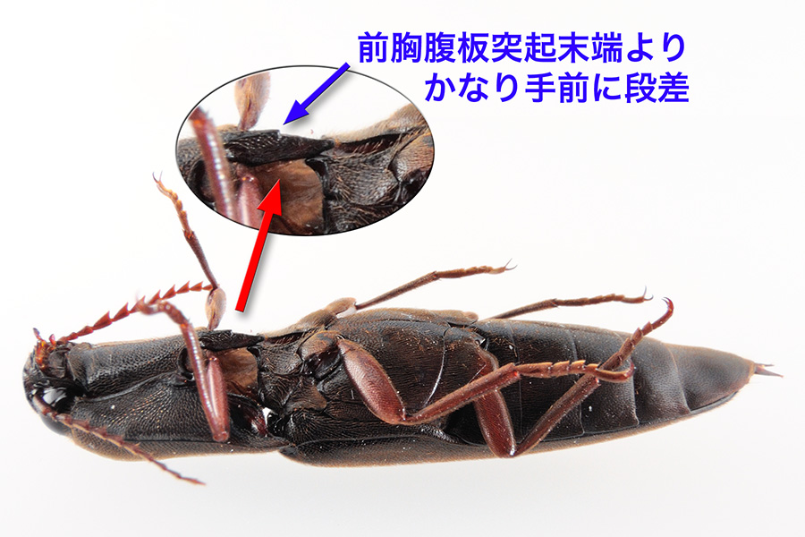 サイズと、前胸背に明確な縦の溝が走らないこと、体は縦に長く上翅は翅端に向けて尖ること、前胸腹板突起の末端よりかなり手前にしっかりした段があること、などから本種と判断しました。