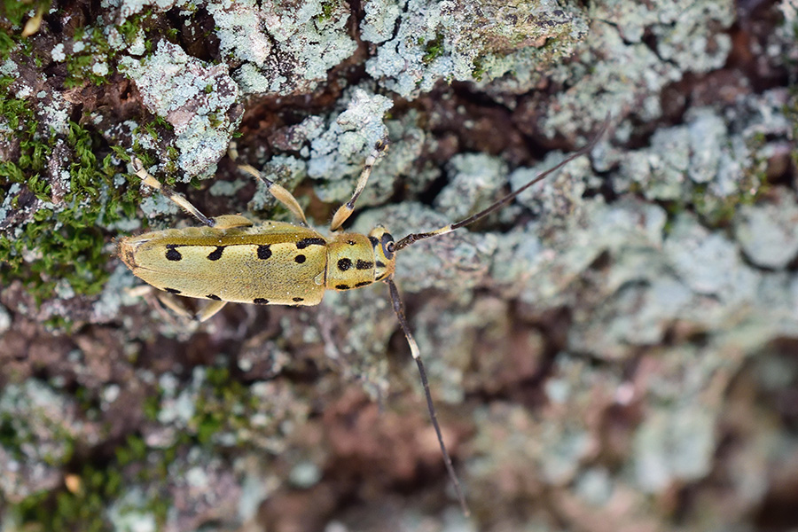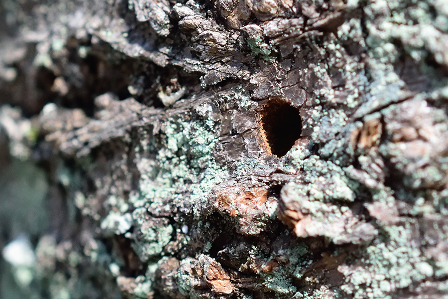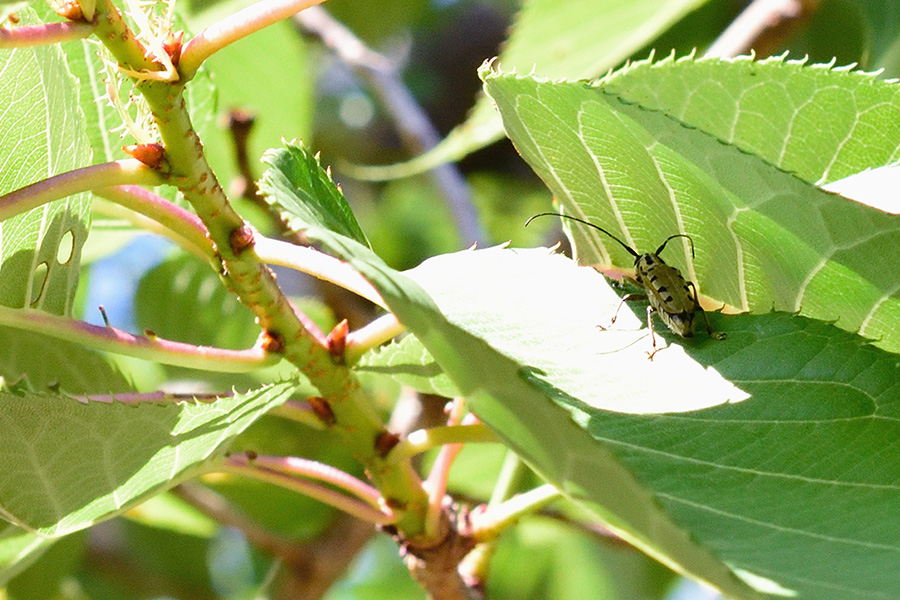 古く苔むしたサクラの幹に5mmほどの穴が開いていたら、ヤツメカミキリの羽脱口の可能性が高く、穴の内側が新鮮なら、かなりの確率で近くにいるのを見つけることができます。