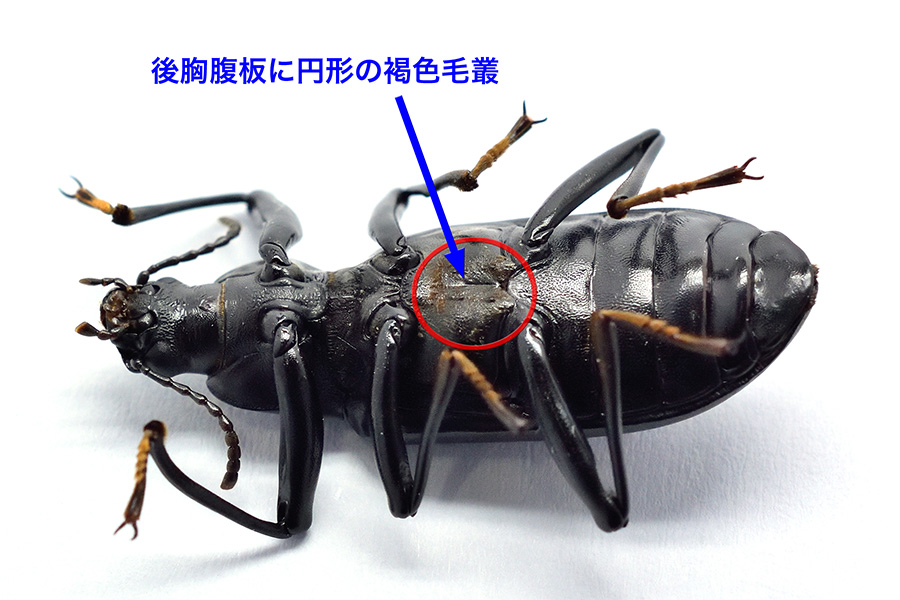 なお、後胸腹板に円形に褐色毛叢が確認できましたが、これもユミアシゴミムシダマシの♂の特徴です。