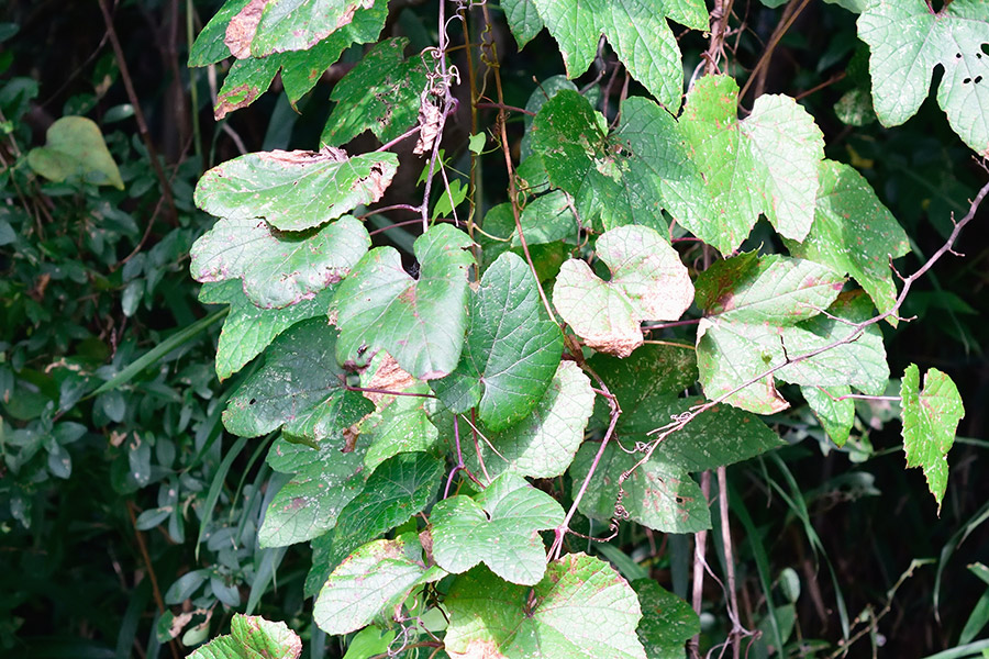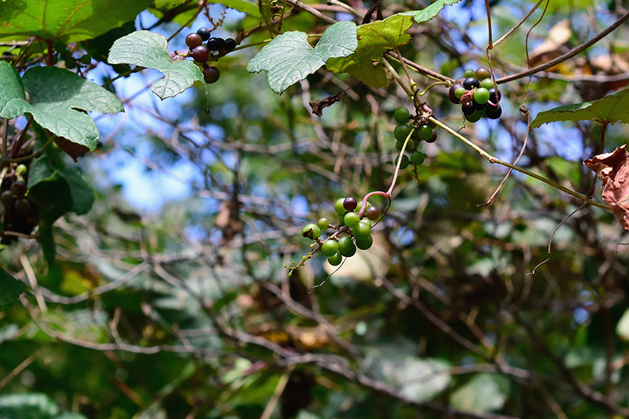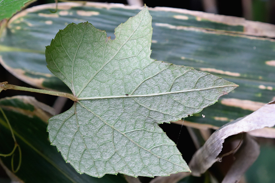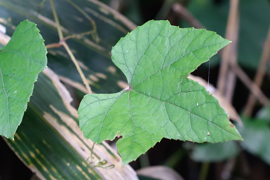 これは、葉先の尖ったタイプ(ノブドウの葉先は更に細く伸びる)ですが、近くには丸いものも多く見られ、そちらには若い実がついていました。もしかしたら葉形で雌雄が判るかもと思ったのですが、この付近の株が偶然そうなっていただけのようです。
