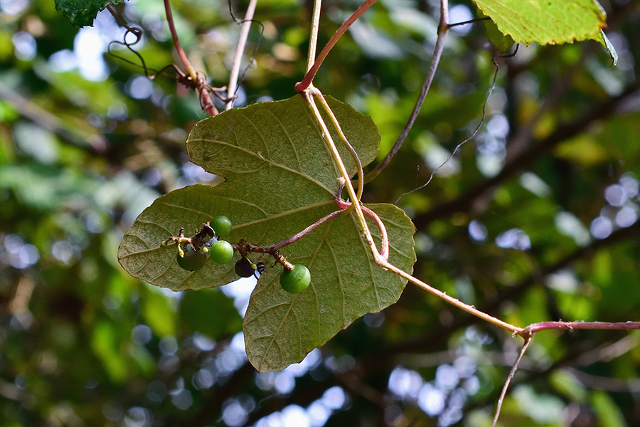 つる性の落葉低木で雌雄異株、ノブドウ(ノブドウ属)と似ていて、どちらも里山や藪に普通に見られ、隣り合って生えていることも珍しくありません。