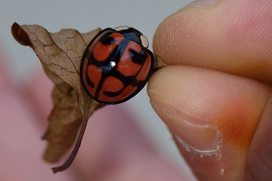 大型の愛らしいテントウムシで、ヤナギハムシやクルミハムシを食べるため、シーズン中はオニグルミなどで見ることができます。