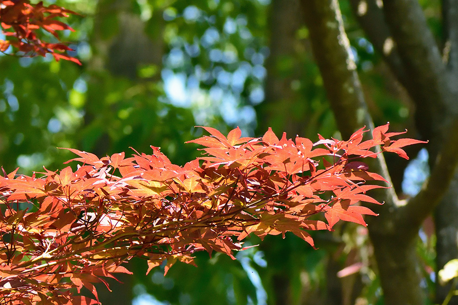 若葉の頃から葉が赤く染まりますが、条件によってその染まり方は大きく違うようで、前年に見たときは、緑の部分が多く残り、斑らになっていました。秋の紅葉時には、輪を掛けて美しく赤くなる(これも条件次第?前々年の紅葉は見事でした)姿を見せてくれます。
