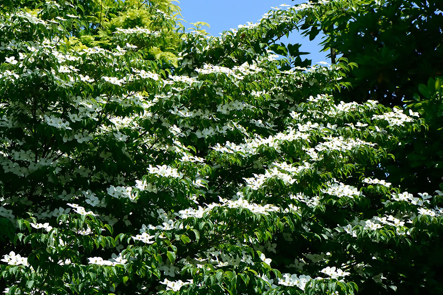 樹高10~15メートルほどになる落葉高木で、葉は対生、ハナミズキ(アメリカヤマボウシ)の花が終わった頃、関東地区では6月ころに開花します。開花時には葉が展開しているので、緑の絨氈に白い花(総苞片)が浮かんだような姿は見ごたえがあります。なお、白い花のように見えるのは、総苞片と呼ばれるもので、花はその中央にあって、撮影日には良い塩梅に開花していました。