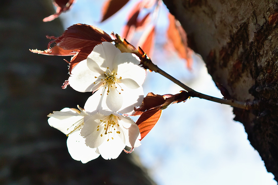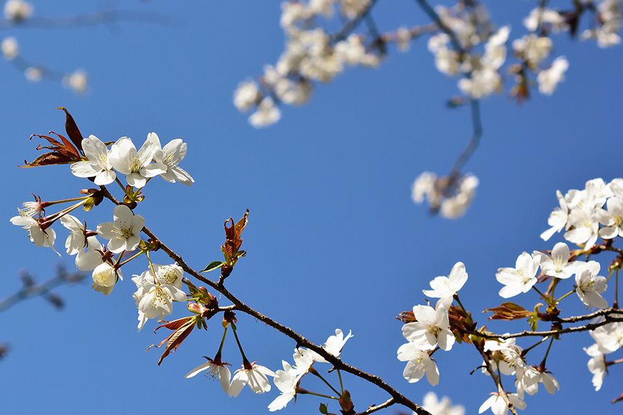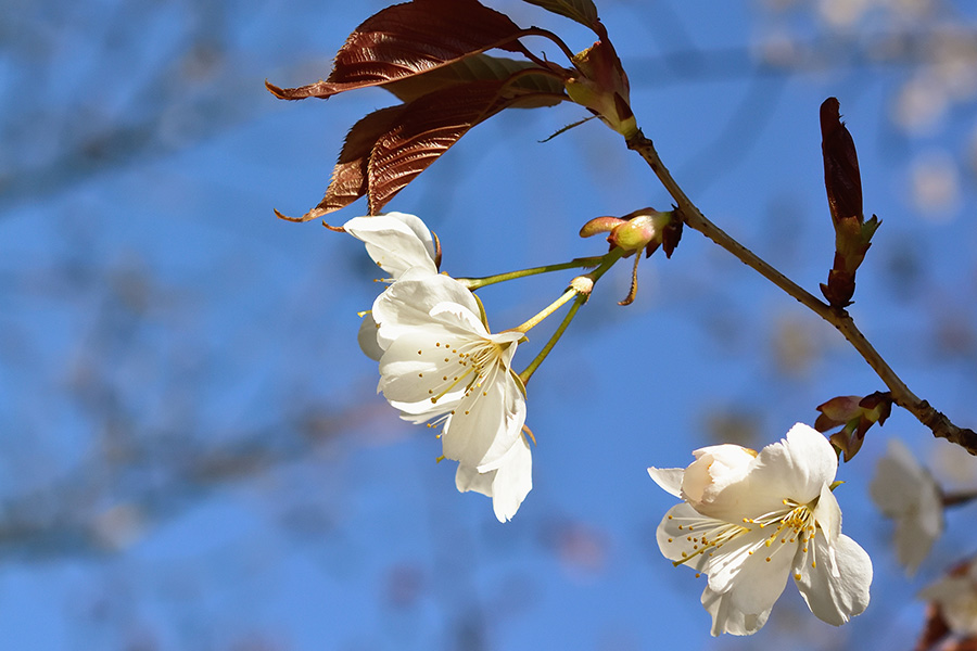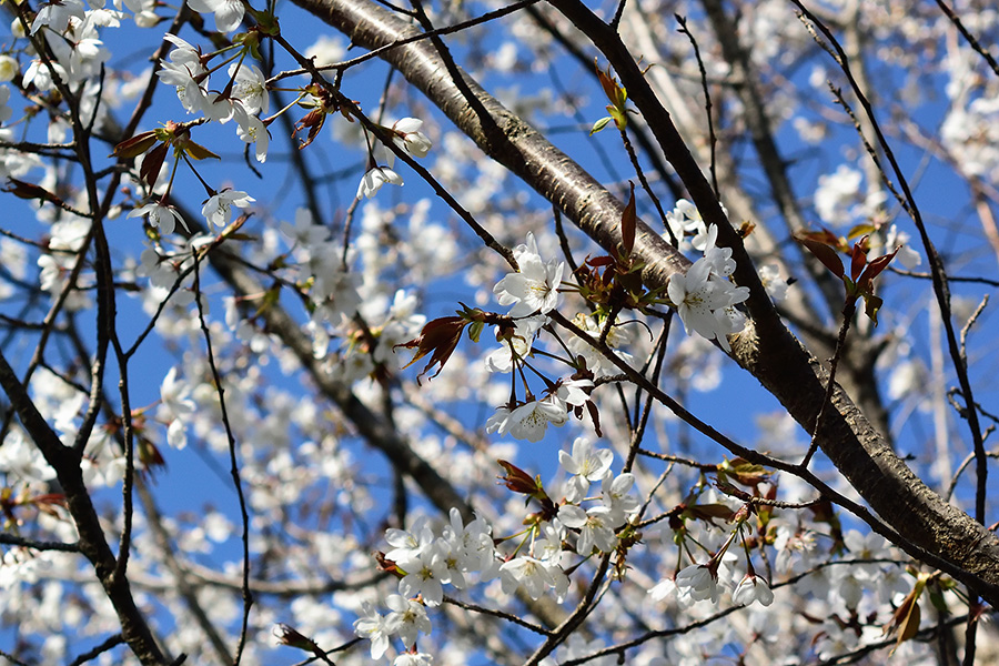 典型的なヤマザクラは、開花時に展開する赤味のある葉と白い花のコントラストも楽しめ、これを遠目で見ると、独特の美しい色味を感じます。