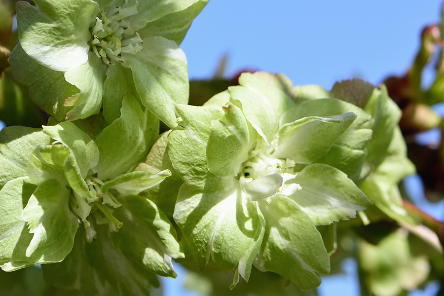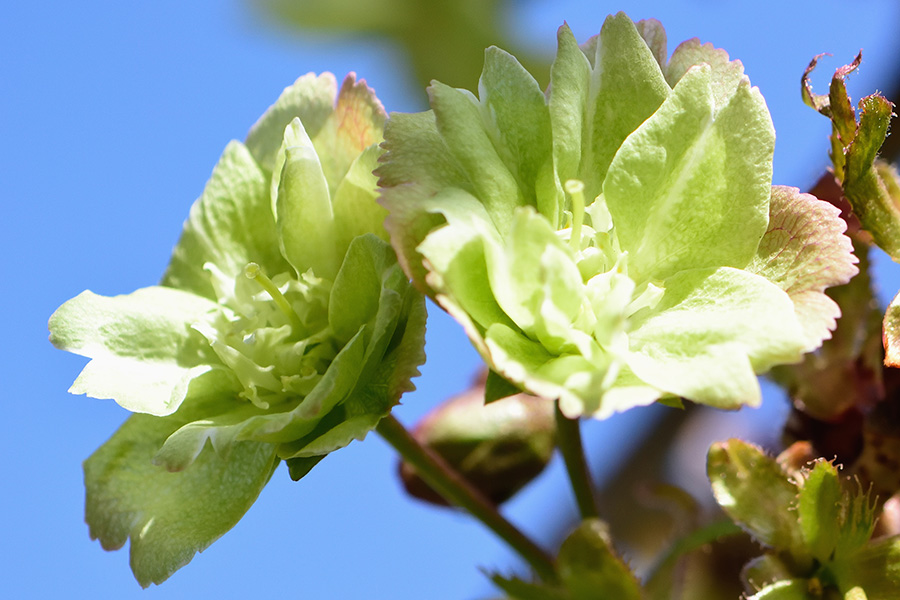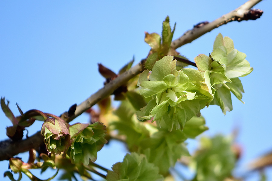 黄緑色の八重桜で、開花時は[サラダの木]と名付けたいくらいです。