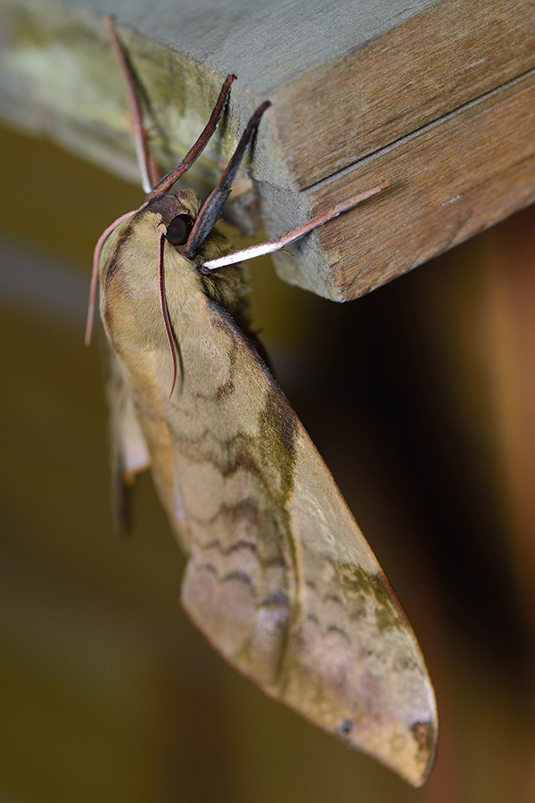 大型のスズメガで、食草はフジ、クズ、等マメ科の植物で、幼虫は黄緑色で、尾角はスズメガにしては短めです。土中で幼虫のまま越冬します。
