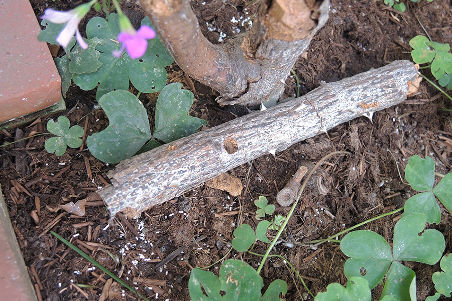 折れた部分にはまん丸の穴が・・・・カミキリ好きならピンとくるアイツが!?