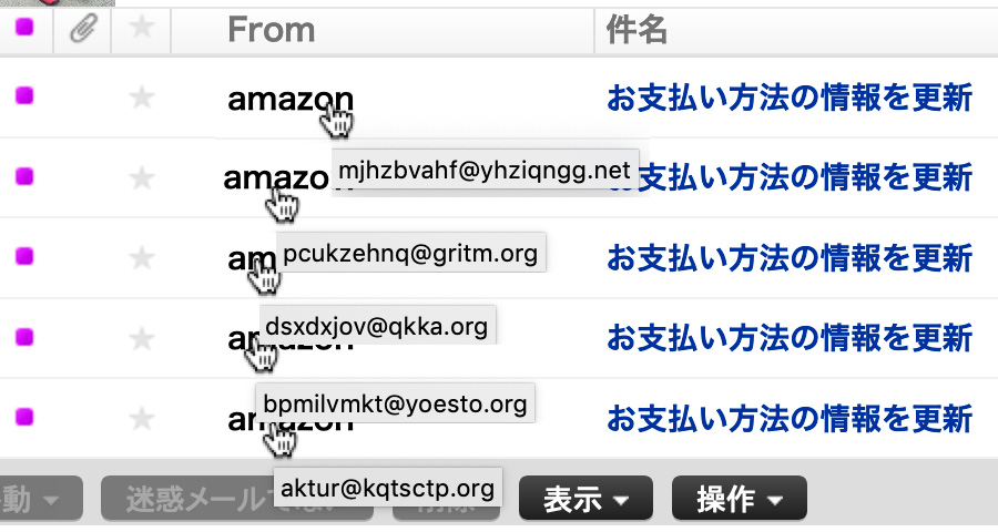 受信拒否しようにも、ご覧の通りアドレスを変えて来るので、拒否リストに追加しても意味がありません。