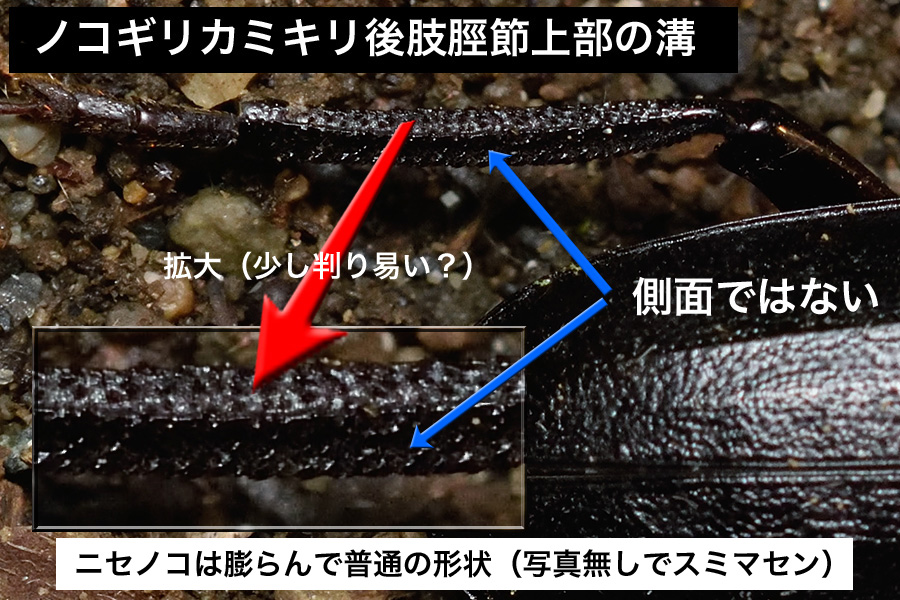 後肢の脛節上部に溝があるのが本種で、ニセノコギリカミキリでは普通にかまぼこのようなアーチになっています。