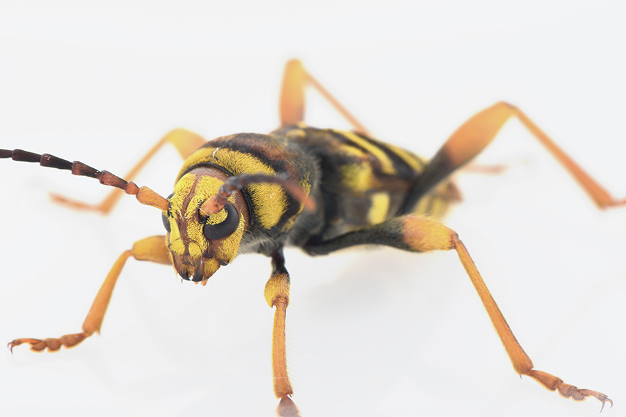 中型の活発なカミキリムシで、スズメバチに似ています。