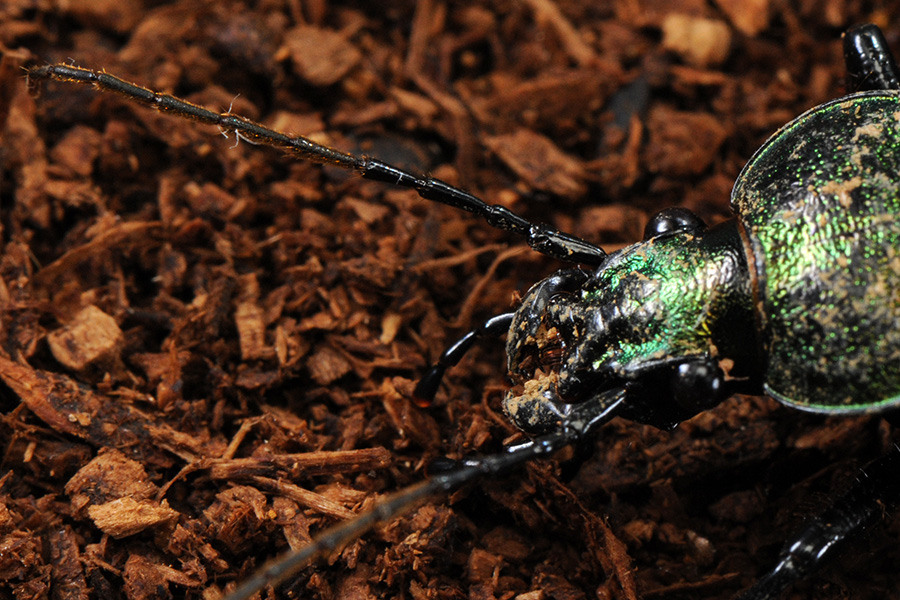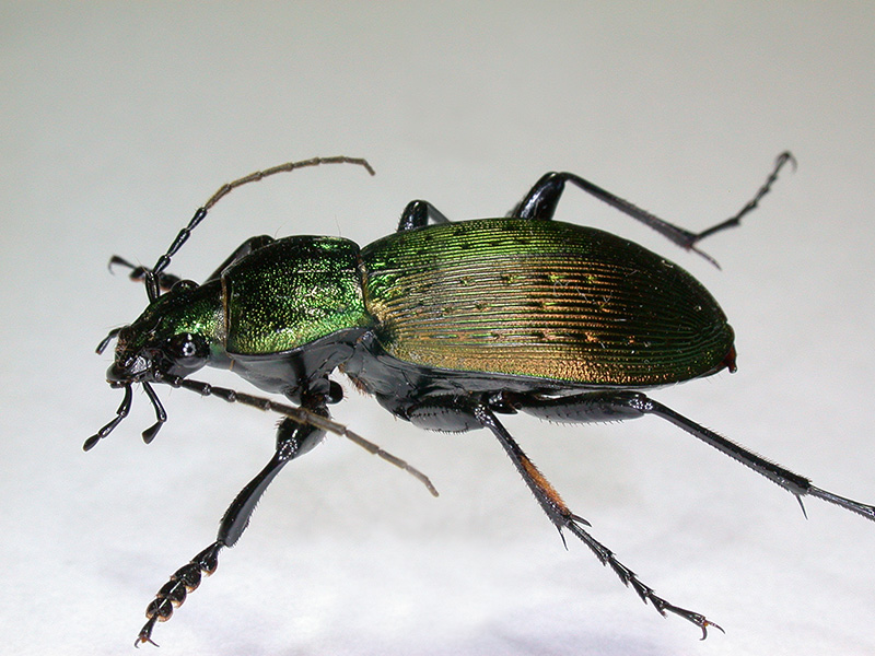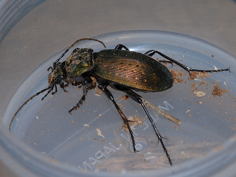 アオオサムシは、関東平野でも普通に見られる大型で美しいオサムシの仲間です。緑色に輝くエリトラ(翅鞘)は個体によって、また光線の状態によって濃い紫から緑まで変化して見えます。