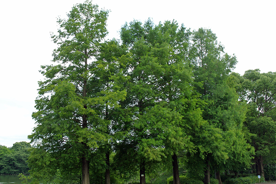 落葉針葉高木で、水に強く、根本が水に浸かっていても問題なく生育できるので、公園の水際にも多く植栽されていますが、通常の土壌でも生育します。なお、水際では気根と呼ばれる呼吸根が出てきます。メタセコイアに似ていますが、枝振りや葉の生え方(メタセコイアは対生、本種は互生)で見分けられます。