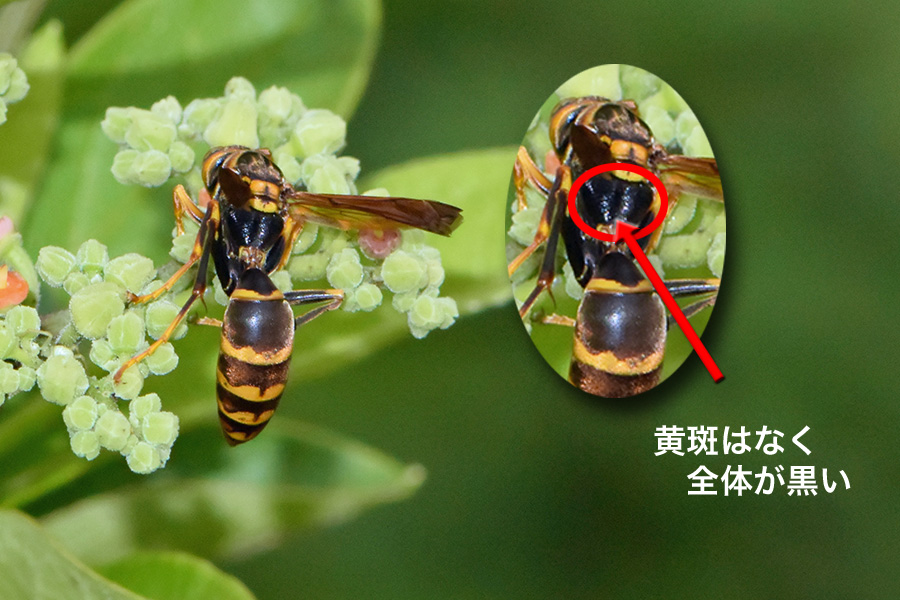 ほぼ同様のサイズと攻撃性を持ったキアシナガバチに似ていますが、前伸腹節(感覚的には胸部最後部の逆円錐部)背面に一対の黄色い斑紋があるのがキアシナガバチ(やや小型のヤマトアシナガバチも同様の斑紋あり)で、本種には斑紋が見えません。