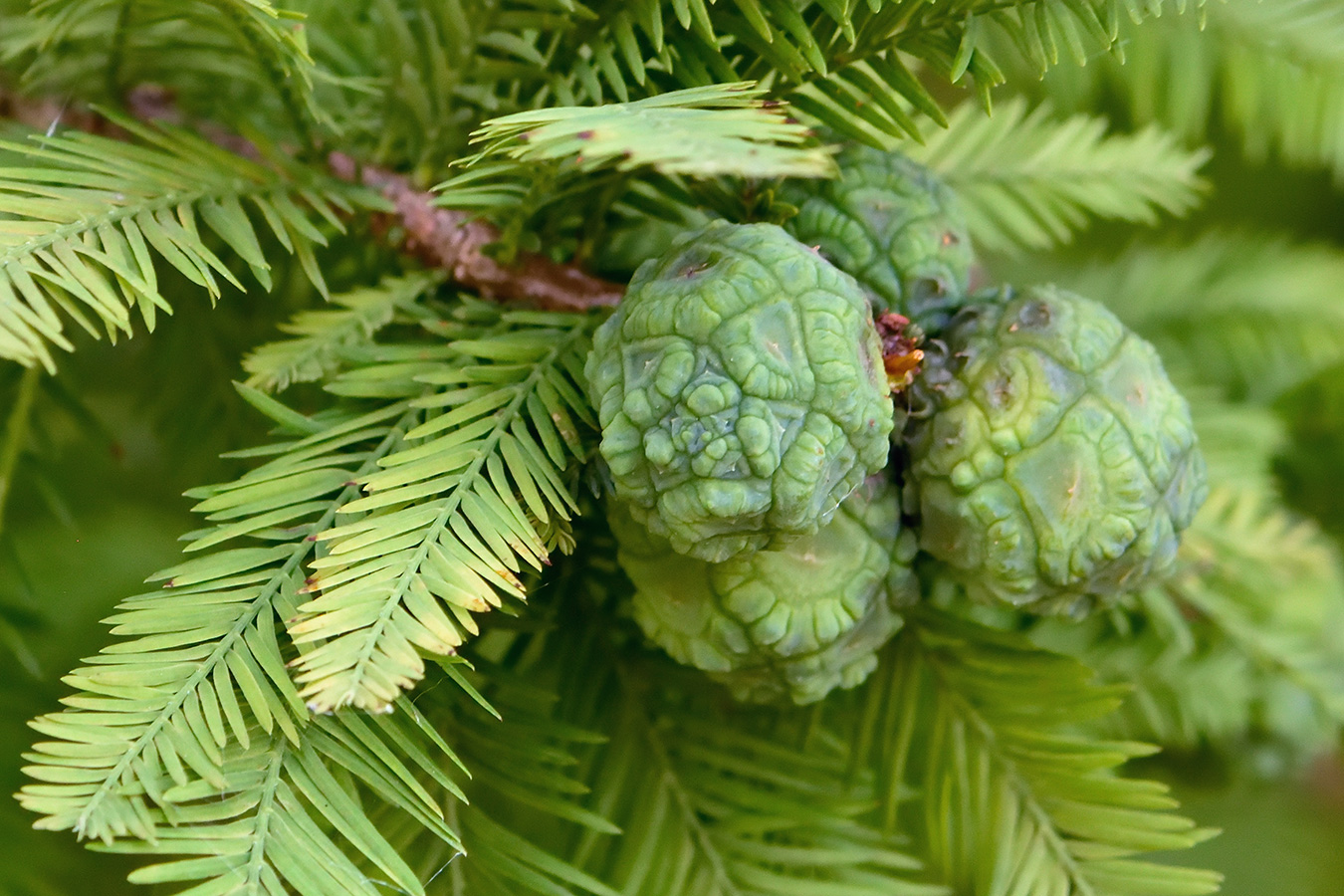 梅雨の頃を過ぎるとラクウショウの実が膨らんできて、メタセコイアとの違いが判り易い季節になります。