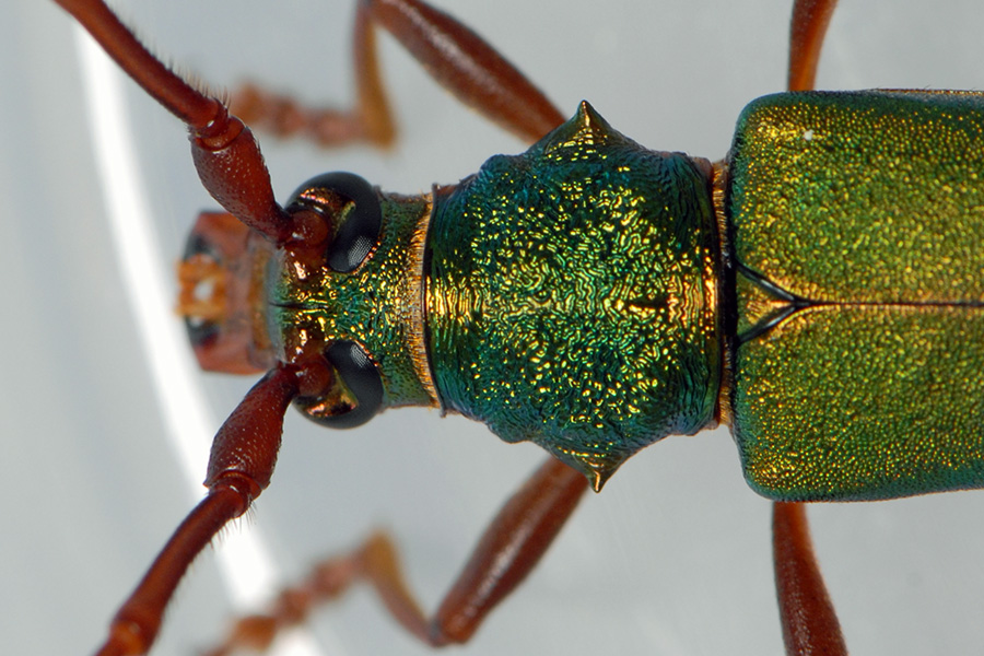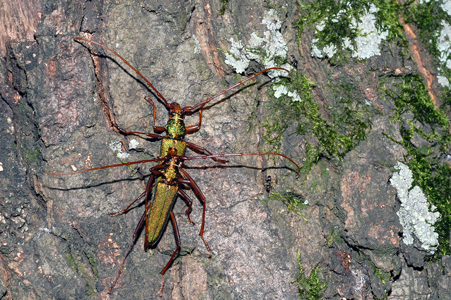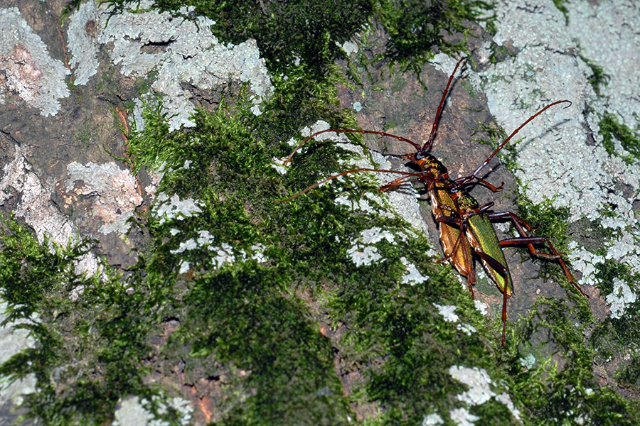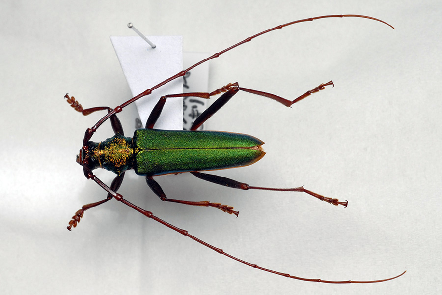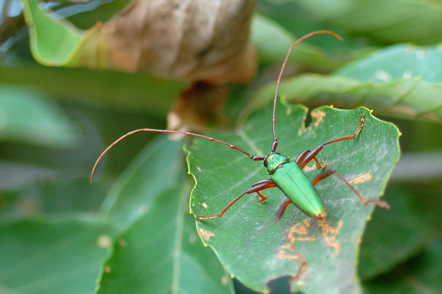 里山のような身近な環境に住むアカアシオオアオカミキリです。