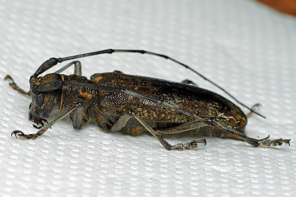 オオトラカミキリを狙ってモミ(樅)を探索した際に出会ったヒゲナガカミキリの雌です。初遭遇ではありませんが、なかなか迫力のある姿をしています。