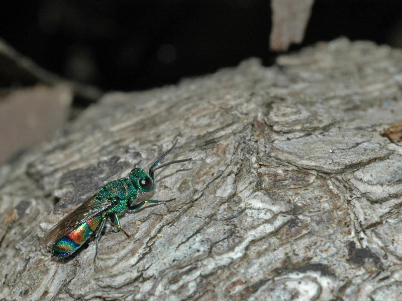 セイボウ(青蜂)という美しい蜂がいることを知ってからは、一度この目で見たいものだと意識していたのですが、意外にも今年から何度か訪れるようになった低山の裾の材置き場で確認することができました。最初の邂逅時は証拠写真程度しか撮れなかったのですが、二度目のこの日は獲物を待っているのか、比較的落ち着いていて満足できる写真を撮ることができました。