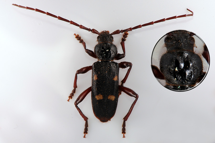 さておき、関東では身近な春のカミキリムシで、まあ見飽きそうなものですが、前胸背に独特な模様があったり、完全に消失して全体が黒くなるものも含めて上翅の斑紋変異が楽しめるのも魅力で、[我が家的]に言えば[カミキリスイッチ]であります。
