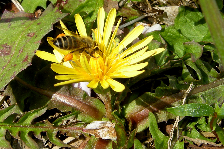 ニホンミツバチ(多分)がカントウタンポポにやって来ています。