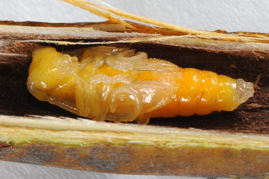 カミキリムシは鱗翅類(蛾や蝶)のように蛹の期間は長くなく、完全に動かなくなる期間がありません。刺激すれば、腹部を反らせたり、腰を振るような動きをします。正しい表現ではないでしょうが、蛹という形態のある[不完全変態]のようなイメージで捉えています。