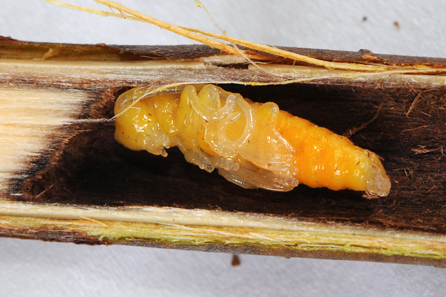 時期的にはもう成虫が潜んでいるかなと期待していましたが、蛹でした。蛹の大きさと比べると、木屑の大きさがお判りいただけると思います。