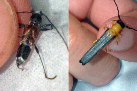 写真右はソボリンゴカミキリ。これはそれらしき痕跡を確認してから足掛け3年目でようやくシャクナゲで確保できました。私は痕跡確認のときだけでしたが、タイミングが合って狙い通りいてくれると嬉しさも倍増しますね。