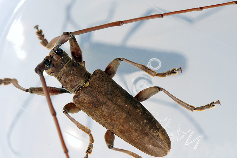 で、チャイロヒゲビロウドカミキリ