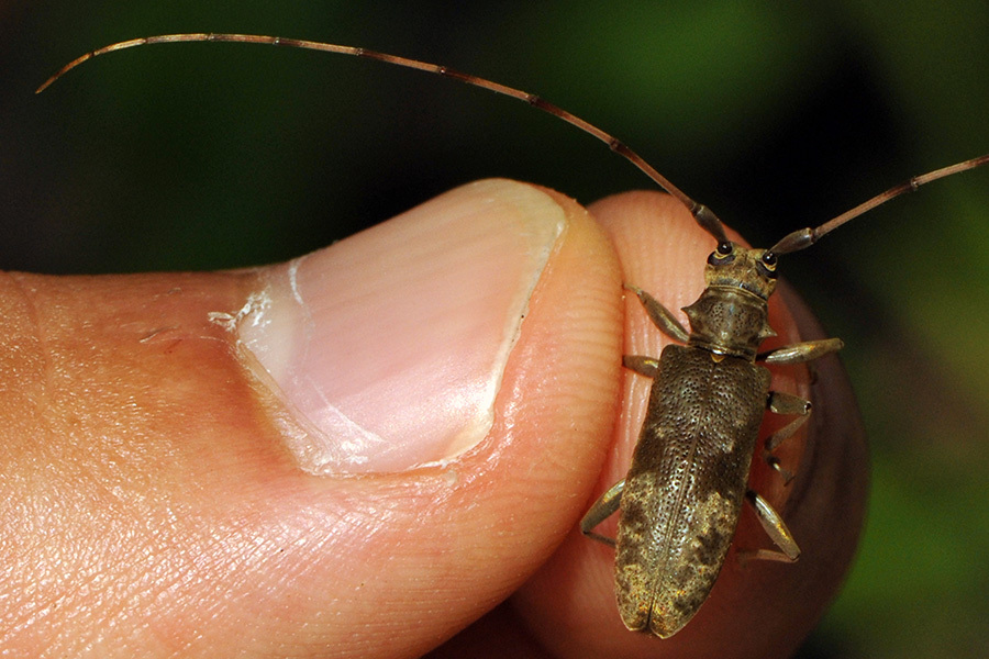 クマシデに大きな触覚と影が見えたので、クワカミキリやミヤマカミキリかと思ったのですが、面白いので叩いてみると、巨大なアオスジカミキリでした。羽化に失敗したのか触覚が途中で半折れのようになっていました。
