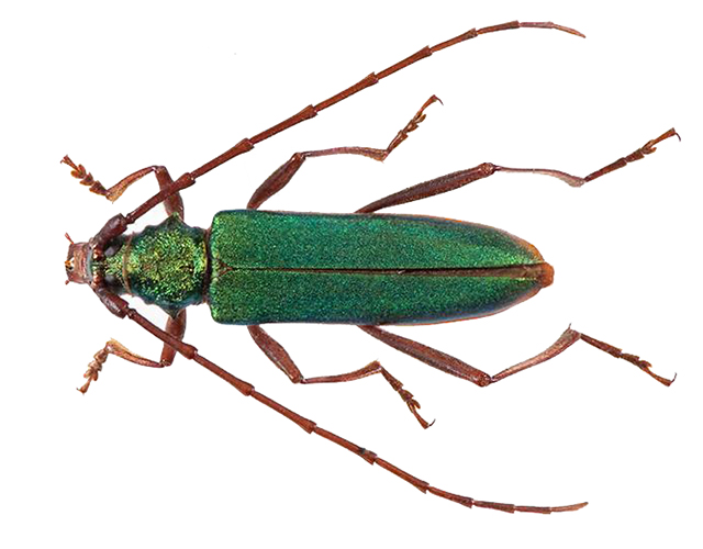 手近にあったアカアシオオアオカミキリの標本でトライアルしてみましたが、触角とふ節に意識がいってしまったため、肝心のエリトラ(翅鞘)のピンの出ている画像が無く、妙な結果になりましたが、使える目処が立ちました。