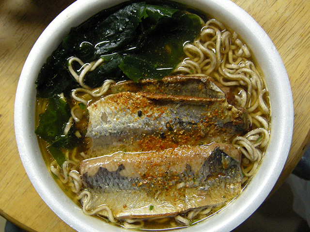 できあがったカップ麺に缶詰めの鰊の身を載せるだけですが、