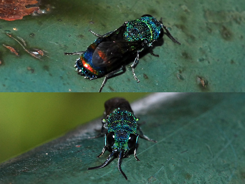 筑波山裏にある自販機小屋から、裏手に降りる手すりをうろうろとしていたセイボウです。ムツバセイボウじゃないかなと思ってますが、自信はあまりありません。きらきらと敏捷で奇麗な虫です。