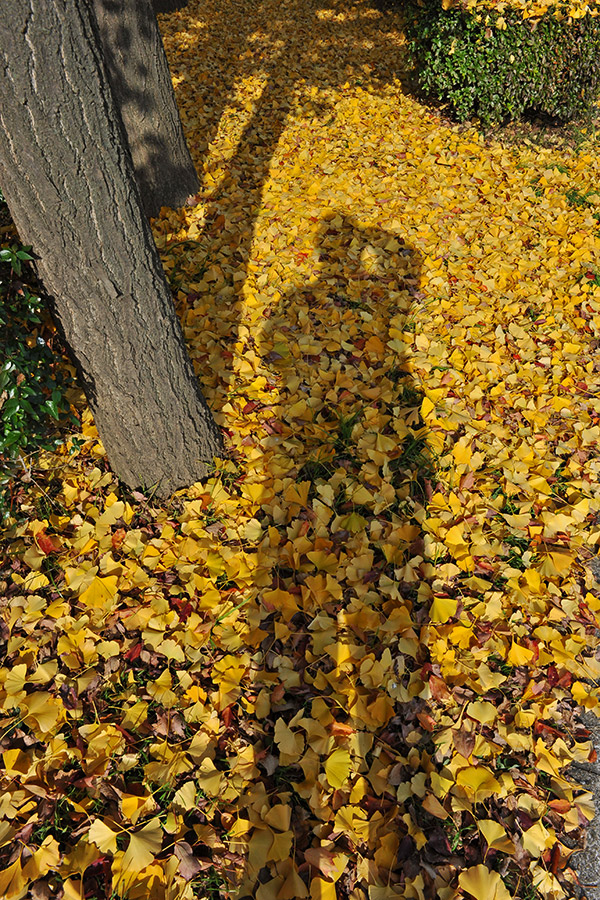 ドウダンの生け垣にイチョウの葉が積もっていました。