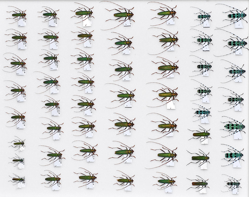 ひとえに心技体の所為ですね。で、閑になってくると標本の整理が始るのですが、だいたい奥秩父方面、茨城方面のカミキリムシがこんな風に並んでいき、あっという間に定員オーバー。