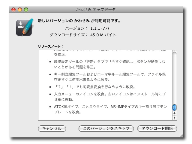 雪豹の日本語入力プログラム[かわせみ]のアップデートがありました。