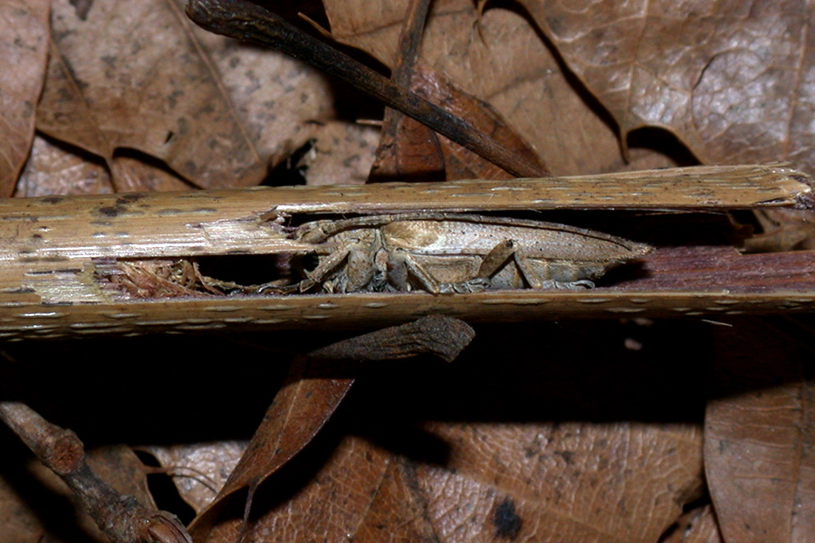 冬季採集の入門的定番のハイイロヤハズカミキリです。