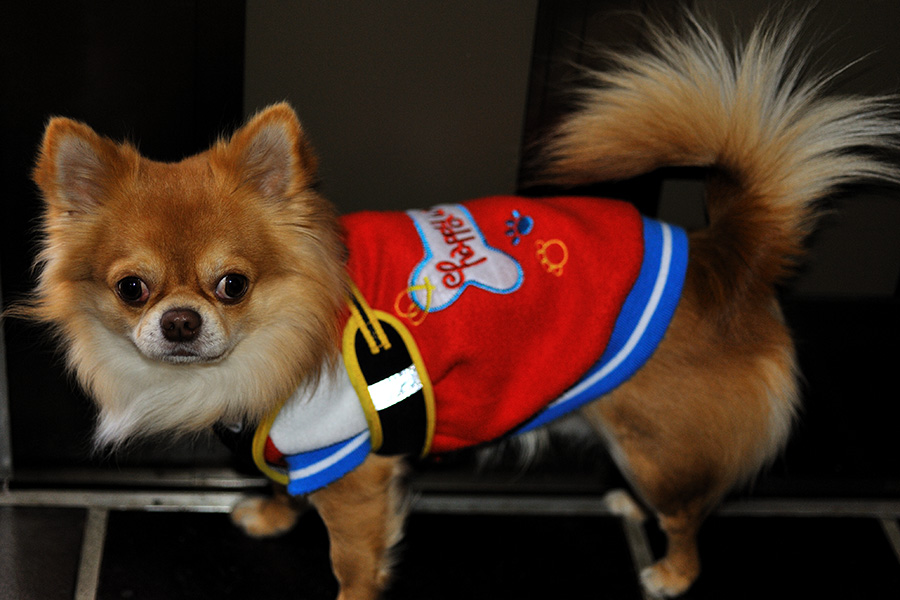 散歩用の服(とは呼ばないのかな?)を着せると、顔のまわりの[むだ毛](と私は呼んでいる)が、へっぴり腰のライオンような風情になって笑えます。眉のところが白っぽいので、眩しいところに出て目を瞬くと亀仙人のようになってしまいます。