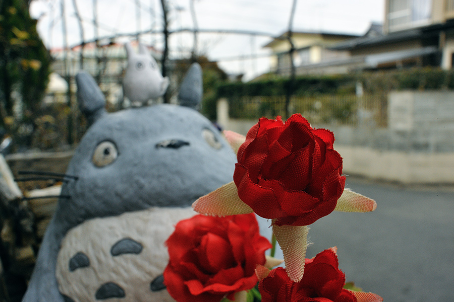 我が家のトトロに布製の真っ赤な花を持ってもらってぱちり。