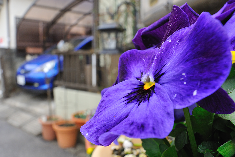 次は我が家の[スーパーカー?]をバックにパンジーです。