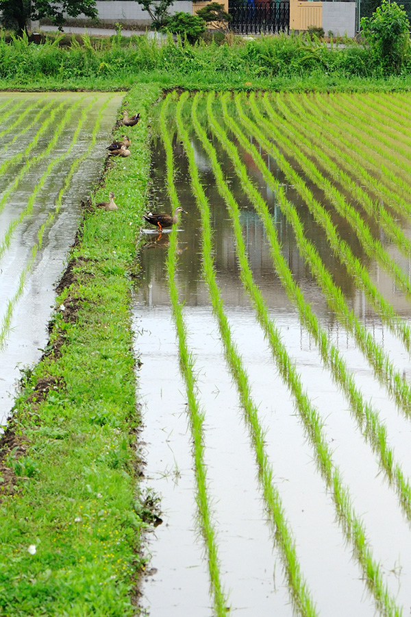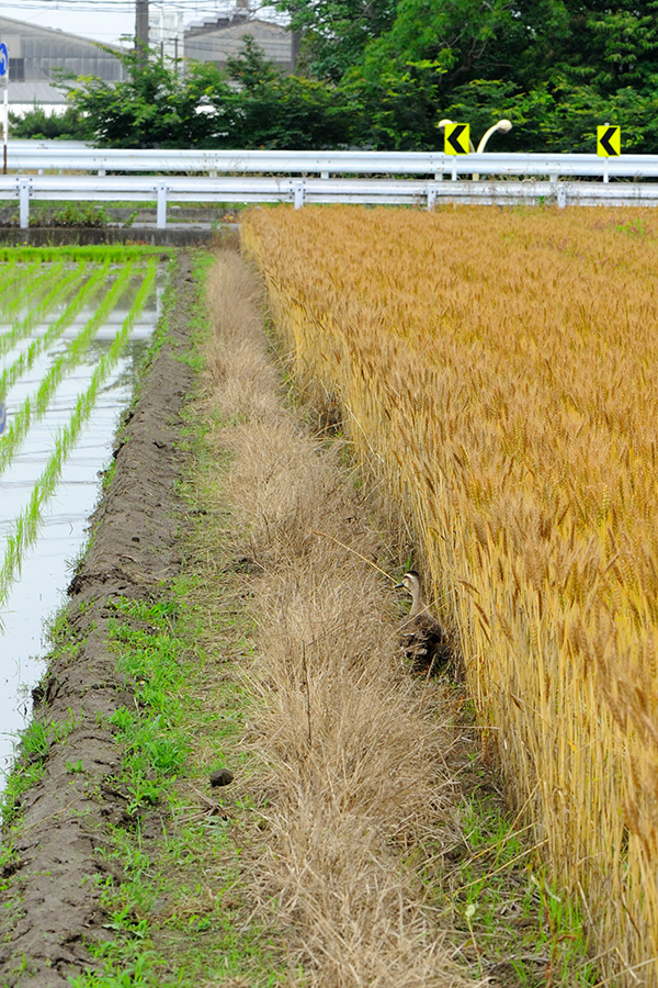 麦畑の手前でまず眼に止まったのは、畦道に休むカモたちです。いわゆる合鴨農法でしょうか?周囲にネットも張っていないのは、町の“濃度”が外敵の心配の無い丁度良い具合なのでしょう。