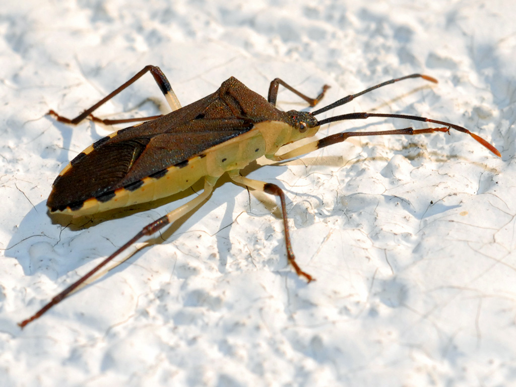 キバラヘリカメムシは腹部と腿の美しい黄色と茶のコントラストが見事な大型のカメムシですが、2007年11月24日柏市郊外の住宅地(公園トイレの壁)で撮影しました。