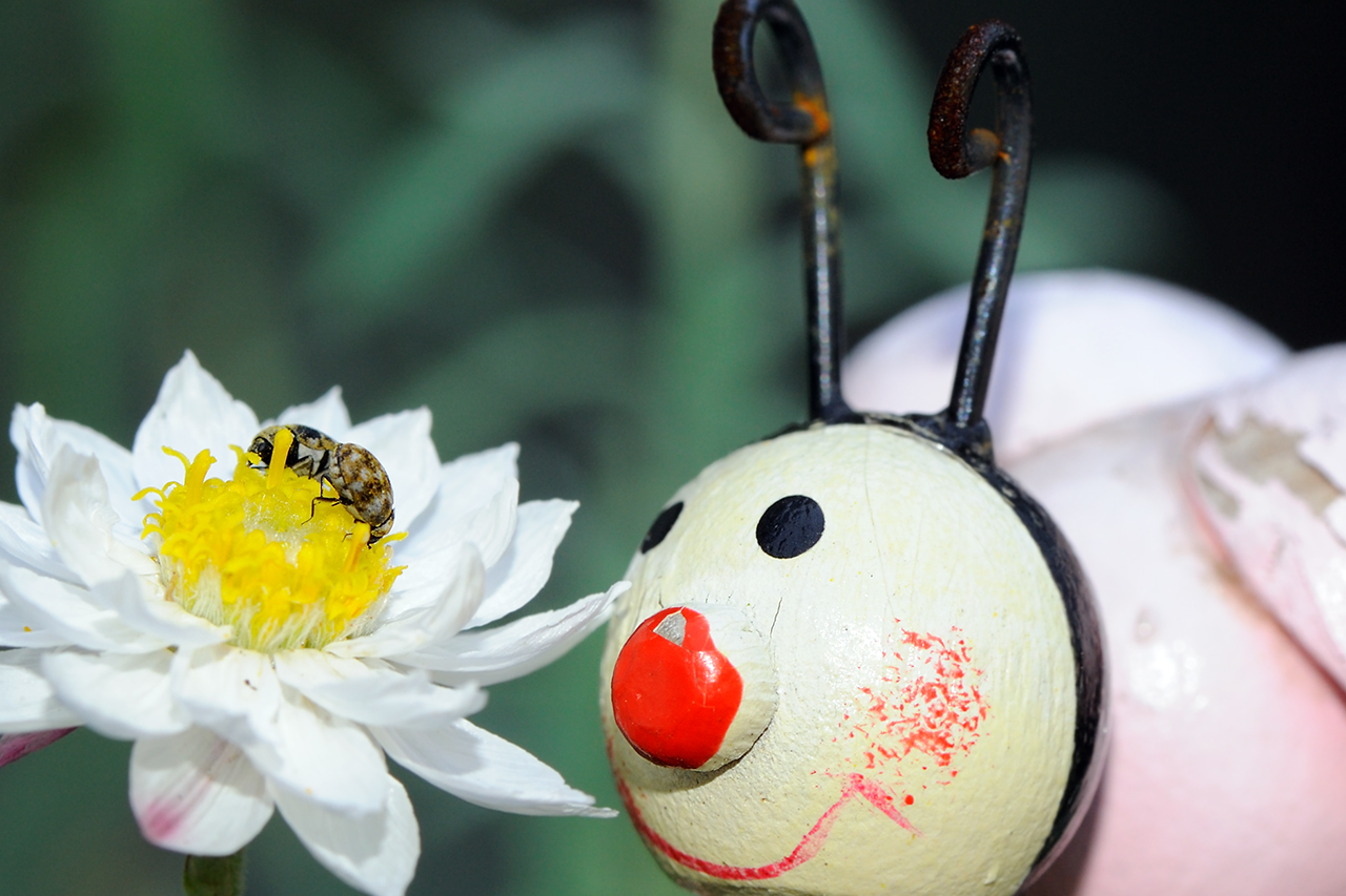 ちょうど、ガーデンアクセサリーの近くの花にいたので、演出に